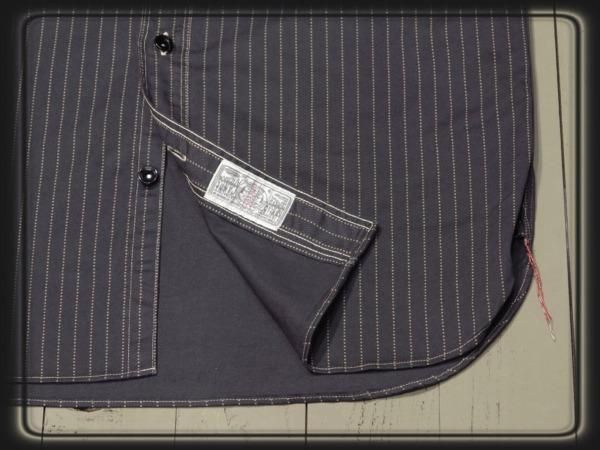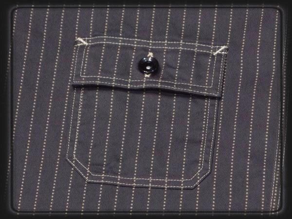背ヨークの下部分には変型の見返し、胸のポケットは戦前のワークシャツにみられる左右非対称の通称「ガチャポケ」仕様。
