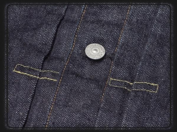左胸ポケットのフラップの裏側にはライトオンスデニムを使用し、前身頃の身返し端にはセルビッジが見られる。