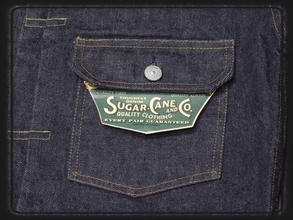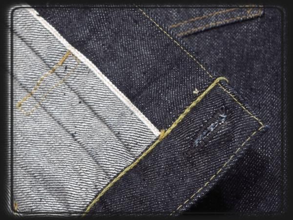 経糸7番×緯糸7番の未熟な紡績のムラ糸を使用した13.5oz.セルビッジデニムに、戦前らしいオレンジがメインのステッチワークが映えている。